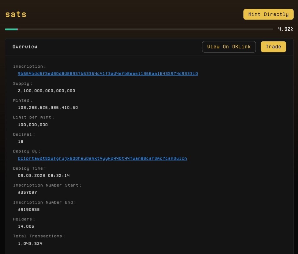 BRC20 tokenlerinden bence en çılgını $sats !Her bir #Bitcoin 100 milyon Sats’tan (satoshi) oluşuyor. İsmini de buradan almış ancak yine de karıştırmayın; per başına limit olan 100 milyon adet sats tokeni alınca, 1 bitcoininiz olmuyor 🙂